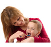 Try having your child lie down. Put your child on your lap or on the floor, keeping his/her head steady with your legs. If your child is standing, have his/her back to you with their head tilted slightly and resting against your body. Have your child hold a mirror while you brush and floss their teeth so your child can see what is being done.